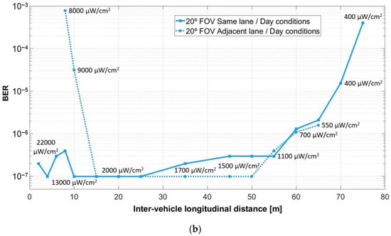 - Avătămăniţei, S.; Căilean, A.; Zadobrischi, E.; Done, A.; Dimian, M.; Popa, V. Intensive Testing of Infrastructure-to-Vehicle Visible Light Communications in Real Outdoor Scenario: Evaluation of a 50 meters link in Direct Sun Exposure. In Proceedings of the 2019 Global LIFI Congress (GLC), Paris, France, 12–13 June 2019; pp. 1–5. [Google Scholar] [CrossRef]