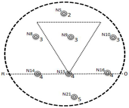 This equation boosts the concept of smooth delivery of data (when there is no void nodes [50,51,52]) and trace out the empty region on the routing path. It fits for medium and large-scale networks because when the number of nodes increases, the ratio of occurrence of empty regions ‘Er’ also increases [53,54]. Selection of the multiple number of nodes increased the data packet ratio and throughput of the network. Another factor that needs to be discussed is the packet acknowledgement (PACK) that helps to select the next layer and node, once the layer will be selected, that is obviously select by PACK, it is easily select the next data forwarder node. This selection leads the routing path through bypassing the empty regions [40] until the data are received to sonobuoys. Basically, the PACK is defined as and is the confirmation of the receiving of beacon or hello packet message. It is the practice of acoustic communication before sending the data to check which nodes are alive/part of the network [55]. If the packet is sent by the node of the first layer (N (l1) to the node of the second layer (N (l2) with the difference between layer (D), it first computes the angle with all coordinates to create an existing routing path between these layers with a possible direction. The selection of angle direction would be considered, where there is no ‘Er’ throughout the path. If the consecutive layers are selected for forwarding the data, all layers are responsible for providing their number of nodes to make the route robust. For example, the path was found to be smooth from anchored node to the first layer, and ‘Er’ occurs in the sink neighboring nodes area. The corresponding angle changes the direction of the vector for the flooding of data. The route vector can change at any stage by avoiding the ‘Er’ occurrence, as this is only done to handle the exceptional case. The corresponding mathematical Equation (2) below describes the selection of layers and nodes and routing path with angle: