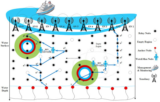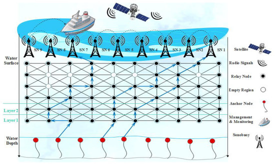 In our work, we made some consideration of this and it is because our focus was on the energy efficiency of the model and avoidance of empty regions [42,43]. (i) The first and foremost consideration is that to sends data for one node to another, it first calculates the angle coordinates on the base of the vector localization service [26,40,41,42,43,44]. (ii) All ordinary nodes send the data packet to sonobuoys simultaneously, and the sink node can receive multiple packets at the same time without any loss of data and collision. (iii) The vertical movements of nodes are negligible; by the way, the horizontal movement of nodes is considered with water current [45,46]. (iv) All the nodes have unique IDs assigned by LBA and will not change in the rest of the network lifetime. (v) The BINs are deployed near sink neighboring nodes so that loss of data inside the empty regions are recovered. (vi) The finding of empty regions is usually near to sink neighboring nodes so that the BIN is also deployed near the sink zone. Figure 2 presents the proposed model in which anchored nodes deployed at bottom that initiates the communication through relay nodes with a mixture of founding empty nodes by using tri-angular calculation. The layer adjustments start from bottom to top so that the communication starts from the first sent by anchored (bottom) and received at the end by sink nodes (top).