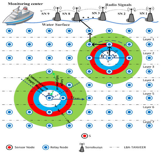 The proposed system model consists of multi-sink architecture that provides communication with all IoT enabled sensor nodes [40]. Nodes are not randomly deployed but in a novel layer-by-layer hierarchy in which every node obtains a unique ID that is static unless the communication is not started. These nodes are responsible for collecting and transmitting the data to each other and send them to the sink of neighboring nodes. Sink neighboring nodes further send to sonobuoys that are present at the surface of the water. Some nodes are placed at the bottom of the ocean that are usually called anchored nodes. The purpose of adjustment of nodes in a layer-by-layer manner is basically to support the dynamic environment of water, as water is a very remote and shallow area, and it is believed that the unmanned effort is required so it is necessary to set the criteria to control these nodes random movements that continuously happened from water currents [6,7]. By assigning the IDs and its mechanism we introduce the LBA-TANVEER in which the whole mechanism is presented.