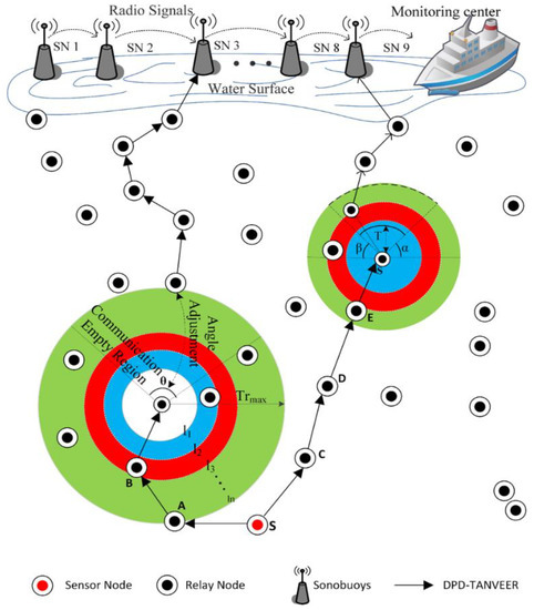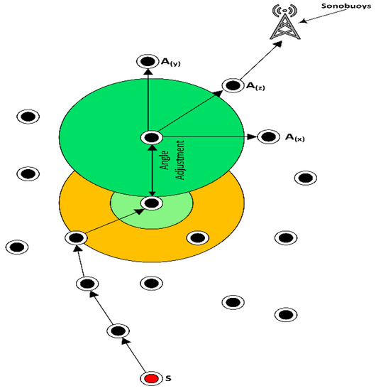 The underwater topology is randomly deployed where the source and sonobuoys are far apart from each other. Therefore, the energy consumption of nodes is deprecated. Forwarding nodes try to transmit the data, but early deprecation of nodes (that bear the total traffic of the source and intermediate nodes) creates empty regions. Furthermore, when the node starts data forwarding and does not know the exact location where empty regions exist [38]. Mostly, the data are not forwarded due to the presence of empty regions inside the route information. The proper angle towards the node does not consider while forwarding; as a result, the delay and low PDR come into exists. The empty gaps near the sink’s neighboring nodes are needed to fix, as these sink neighboring nodes are responsible for covering these void holes successfully at both ends. However, the empty regions can also be covered by the adjustment of nodes depth level. The adjustment of the node’s depth is based on angle and movement as described in Figure 1. The movement and alignment of nodes are discussed in the literature and in the baseline approach that is taken for comparison, i.e., angle-based approach where each node is aligned up to some angle and with layer-based hierarchy. Moreover, the overhead cache is increased when, for each iteration, the angle needs to be computed. Another problem is that by checking the continuous energy status of nodes, like sink neighboring nodes, is not possible as per some opportunistic routing protocols do this easily [39]. Additionally, most of the previous approach where these issues try to enhance the energy of sink neighboring nodes, is all in vain. The reason is that the energy of the overall network is decreased when a large amount of this material is considered to be dedicated to particular sink neighboring nodes in the underwater acoustic environment. Therefore, the energy sources our primary check for the proposed technique. This approach is also successful in sparse and dense water areas.