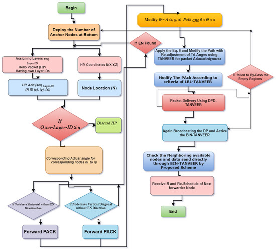 It takes the data from the empty node like ‘n4′ and delivers them to the next available node. The recovery procedure works with looking forward to the least number of layer count and tries to find out the next nearest node in order to proposed mechanism energy efficient with all aspects. In this way, instead of dropping the packets and increasing the packet loss ratio of the overall network, BIN nodes are responsible for doing this every time. Therefore, they come into contact or active only when the empty regions are detected. Meanwhile, the detection of empty regions is done by receiving the ‘PACK’ of the nodes as in Equation (6), and ‘PCHG’ is basically the function of BIN-TANVEER, and it used for the recovery procedure. In an exceptional case, if the availability of the node is not present around the empty regions, then BIN sends a data packet greedily to sonobuoys. Otherwise, it transfers the information to the nearest node for successful data communication among the network nodes. Figure 7 shows the working of BIN-TANVEER and Figure 8 represents the transmission adjustment of watchman, while Algorithm 3 depicts the proposed mechanism. Moreover, the flowchart of proposed scheme and its sub-sections are illustrated in Figure 9.