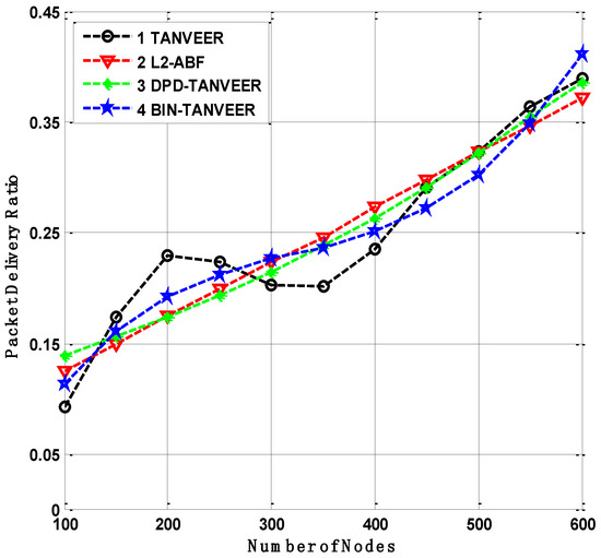 It is assumed that the delivery ratio is directly proportional to the number of nodes increased in the network [57]. Therefore, the density plays a part and parcel role in the underwater environment. It is clear that the BIN-TANVEER has the highest PDR results due to the functional nature of the proposed mechanism. As BIN is working for the rescue nodes to avoid the data loss, hence the PDR is achieved at the desired amount even in the density of the network. When the trap of the empty region is going to start the avoidance of data loss, alternative nodes in the form of BIN are considered the best substitute to deliver the data to nearby sonobuoys. Meanwhile, the TANVEER describes the average success ratio of packet transmissions, i.e., it is neither high nor low, because it operates is single parameter total packet delivered to the sonobuoys. The dynamic topology of the network is also affecting the efficiency of data transmission due to nodes movements.