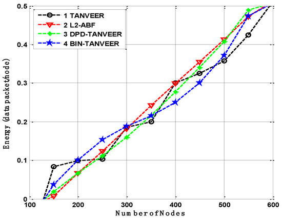 The comparison of energy consumption is displayed in Figure 14, where the energy is delivering a single packet towards the destination. It observed that the minimum energy consumption for the DPD-TANVEER is when it could bypass the empty regions and directly sends the data packets to the sonobuoys, so it is slightly lower than L2-ABF. The minimum possible energy consumption for each packet is 0.3 J with DPD-TAANVEER and 0.4 J of L2-ABF. This is only due to singe angle-based measuring for the dissemination of the data packets.