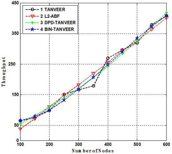 Figure 15 presents the throughput of the network that indicates the successful packets delivery from source to sonobuoys, and it is measured in bits/second (bps). The TANVEER have streamline throughput for 250 number of nodes with the throughput of 130 bps. As the number of nodes increased, the occurrence of empty regions starts, and the nodes are willing to finding the alternate path. In this situation, the TANVEER suddenly decreased up to 110 bps and then again increased up to 260 bps for the next 100 number of nodes, at this point, it was smooth throughout the network’s lifetime and achieved 370 bps for full number of nodes that are used under experiment. The DPD/BIN-TANVEER both depict the same behavior that started from 40 nodes with 45 bps and achieved 400 bps with 500 nodes, the reason is that as the empty region is found inside the network the routing path is changed and serve as BIN-TANVEER and the ratio of DPD is increased for the time being. In this case, the TANVEER consumes little more energy, but throughput is reached at 370 bps.