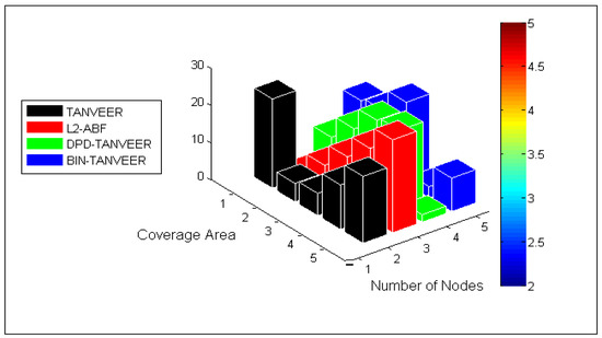 From Figure 16, in order to verify the coverage area of the TANVEER, BIN-TANVEER, and DPD-TANVEER, we have conducted simulation against the number of nodes and coverage area. The slip of the area is also shown beside the simulation graph. From Figure 13, TANVEER has the highest coverage area among all other sub-sections, including the baseline approach. For example, the L2-ABF works with 500 nodes, and the quantity of nodes with TANVEER is 100 more nodes in order to cover the simulation environment and network volume.