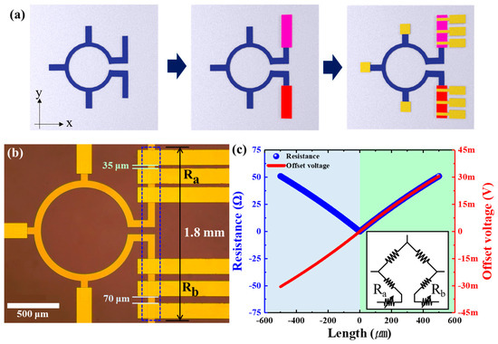 The PHMR sensor was fabricated using a bilayer magnetic thin film deposited by a DC-magnetron sputtering system. The bilayer structure was made of Ta(5 nm)/NiFe(10 nm)/IrMn(10 nm)/Ta(5 nm) and grown on a 500 nm SiO2 substrate using the wet oxidation process. The film was capped with a thin Ta layer (5 nm) to prevent oxidation. The bilayer structure was exchange-coupled and had negligible hysteresis for magnetic fields perpendicular to the exchange bias [44,45]. A uniform magnetic field of 25 mT was applied in the film plane during the deposition to induce the magnetic anisotropy in the ferromagnetic layer to define the exchange bias direction in the bilayer structure. During the thin film deposition process, a base pressure of 1.7 × 10−7 Torr was maintained under an Ar (99.999 %) pressure of 3 × 10−3 Torr. The ring-type self-balanced bridge sensor, the resistors, and electrode were patterned through UV–photolithography and a lift-off process to design the potentiometer circuit of the compensator and electrical contact pads. Figure 1a shows a reconfigured ring-shaped, self-balanced bridge-type sensor with a potentiometric circuit to tune the resistance of the sensor branch. The bridge architecture was designed with a five-electrode structure. The resistance tuner compensators for both arms ( and ) were marked by a blue dotted regime (see Figure 1b), and were separated by 35 μm and 70 μm, respectively, from the electrode to adjust the resistance of each branch. Figure 1c depicts the variation of sensor offset voltage as a function of variable bridge branch length from positive to negative end (red line), and the resistance compensation performance with the changes in branch length (blue line). The resistance compensator demonstrated the additional resistance adjustment functionality for both arms (see Figure 1a) in the proposed self-balanced bridge-type sensor. The detailed compensation method of the resistance compensator is explained in Appendix A.