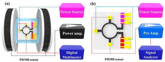 For the sensor characterization, a 2400 Keithley source meter was used to pass the operating current/voltage to the sensor, whereas the output voltage and offset voltage were measured using an HP 34401A digital multimeter. An Agilent 35670A spectrum analyzer was used for noise evaluation. Note that for each measurement, the sensor signal was amplified using a specially designed low-noise preamplifier [46]. In this experimental environment, the amplifier exhibited a white noise level of 1 with a gain of 60 dB. The experimental setup for the PHMR sensor profile measurement system and the noise measurement system are shown in Figure 2a,b, respectively.