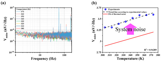 To investigate the thermal noise contribution explicitly, the measurements were performed inside a furnace to maintain a uniform temperature around the sensor in the range of 303 K~373 K with 10 K steps. As shown in Figure 3a, the change in NSD with temperature variation was nominal, and it was difficult to distinguish the different NSDs. To get an accurate comparison of different NSDs, we plotted the estimated average noise as a function of system temperature (see Figure 3b). The blue dot points correspond to experimentally obtained noise data points, whereas the solid black line refers to the linear fit model, as Vnoise was proportional to change in temperature. Importantly, the incremental change in the observed experimental data coincided with the theoretical estimation, and corroborated the validity of the system noise model. As mentioned above, the average noise was extracted from the NSDs at ~100 Hz, where white noise was more dominant. The solid red line indicates the variation of average estimated thermal noise with a y-directional resistive component of sensor (500 Ω). Figure 3b shows that the average noise increased gradually with the increase of temperature, and reached its maximum value of ~3.59 at 373 K. The estimated change in average noise was observed at ~0.28 starting from its room temperature counterpart; i.e., 3.31 at 303 K. However, with a 500 Ω sensor input resistance, the corresponding incremental change in average noise was found to be ~0.31 . Importantly, the total changes in sensor noise as extracted from experimental and numerical resistive models were found very close to each other. This signature confirmed the predominant existence of thermal noise in total noise.