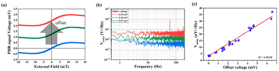 where Ix and Ryx are the sensor operating current and off-diagonal PHMR tensor component, respectively. Note that Voffset represents the DC-offset voltage of the bridge sensor for H = 0 mT, and confirms a correlation with the operating current (see Equation (6)), which eventually generates the intermixing noise in the sensor.
