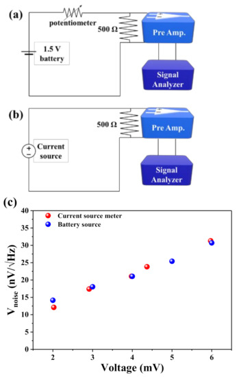 In order to confirm the intermixing noise characteristics generated from the operating current sources, a current source meter and a 1.5 V battery were connected to a resistor of 500 Ω, and the corresponding NSDs were recorded for different bias voltages using a spectrum analyzer. The experimental setups for both modules are shown in Figure 5a,b, respectively. Figure 5c reveals that the total average noise increased linearly with the output voltage of both power sources (source meter and battery module).