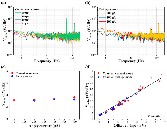 (a) NSD measurements using the driving current source for different driving currents; (b) NSD measurements using a battery source for different driving currents; (c) average noise comparison between the current source meter and battery source driving methods; (d) comparison of noise voltage in constant curent and voltage modes. Noise measurements were performed using a source meter. The solid black line shows the fit as depicted in Equation (8).