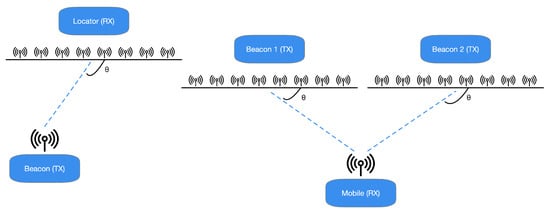 The specifications presented in [25] highlight that the Bluetooth Special Interest Group (SIG) has chosen to promote another radiogoniometry procedure focused on AoD and AoA. In the latter technique, a gathering device pursues the arrival angles for different things. Simultaneously, the AoD assesses its location practicing the angles of various beacons deployed in the environment to be analyzed and their positions, as depicted in Figure 1. It is possible to assert that the decision to incorporate a radiogoniometry peculiarity in Bluetooth 5.1 can be partially based on the circumstance that some organizations provide patented AoD and AoA techniques for BLE stocks. In detail, the analysis of [25] outlines that Bluetooth 5.1 allows developers to utilize RF radiogoniometry more efficiently thanks to the spec update to simplify the control of the IQ signal information (i.e., the data concerning in-phase and quadrature) of BLE packets. Consequently, thanks to this procedure, it is more straightforward to realize applications that include location services. For instance, it is possible to find that the AoA scheme is proper for ascertaining a BLE device transmitting. The transmitter sends radiogoniometry-enabled packets received by a multi-antenna “locator” using a single antenna. The receiver examines the IQ data included in the packets as they pass through all the array’s active antennas. This situation allows detecting the signal’s phase difference due to each antenna’s distance to the individual transmitting antenna. Then, the position processor handles data concerning the phase difference to ascertain the signals’ received angle and, consequently, the transmitter’s direction, as presented in Figure 2. Hence, the combination of the direction of the signals, calculated by several receivers, allows identifying a transmitter, as shown in Figure 3.