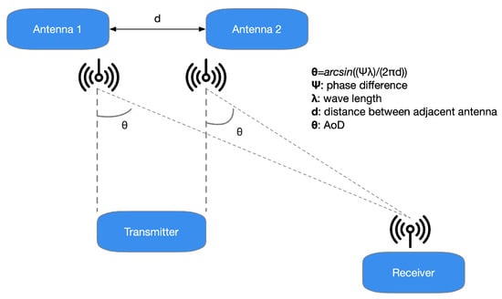 A reversed situation occurs in the case of the AoD method. In this different condition, the antenna array appliance transmits a data signal by its antennas. When every packet transmitted by the antennas’ array reaches the receiver’s antenna, the distinct distance covered from the transmitter ends in a phase-shifted regarding the prior signal (Figure 4).