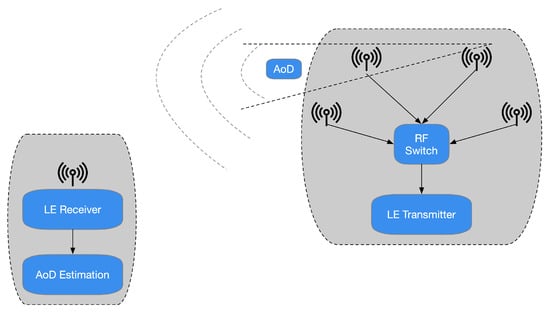 AoD developments are a bit further complicated. In this situation, the antenna array is embedded in the transmitter. The receiver executes IQ sampling, practicing measurements of its antenna. The transmitter antenna design of the remote transmitter is employed to assign various measurements to each specific antenna. On the contrary, the specification noted in [25] states that, in the AoD development, set receiver beacons expect a BLE 5.1 transceiver, multiplied antennas, and an RF switch to broadcast the beacon data. However, a powerful processor and an extra memory demanded in AoA implementations are not required since no signal examination is conducted on this way of the connection. Nevertheless, although the portable receiver requires a single antenna solely, it does not demand both software and hardware to achieve radiogoniometry calculations, as depicted in Figure 6. For instance, it is possible to assume that, for IPS purposes, the receiver could be a BLE 5.1-compliant [25] smartphone [42] with good memory and CPU support to achieve the assignment.