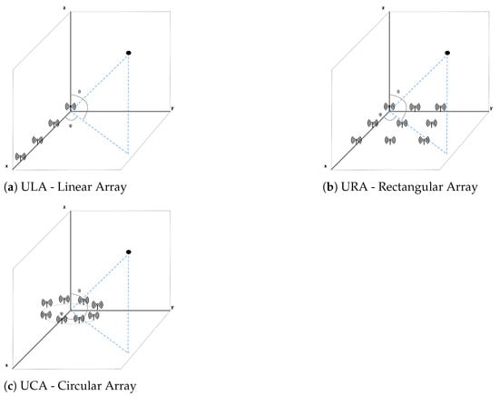 Antenna arrays for radiogoniometry are ordinarily classified into three types: ULA, UCA, and URA. More in detail, the rectangular and circular ones are two-dimensional, while the linear array is one-dimensional. The ULA is the simplest to sketch and actualize; however, it has the disadvantage of determining the azimuth angle considering that the traced device continuously passes on the equivalent flat. On the contrary, accuracy would be compromised if this situation does not occur. UCAs and URAs allow reliably estimating both elevation angles and azimuth (Figure 7).
