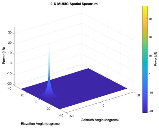 The MUSIC method practices IQ samples to generate a pseudo power spectrum, in which the tip identifies the location of the broadcasting device. The graph depicted in this Figure exhibits a 2D pseudo spectrum, in which the transmitting device is at an azimuth angle of degrees and an elevation angle of 0 degrees.
