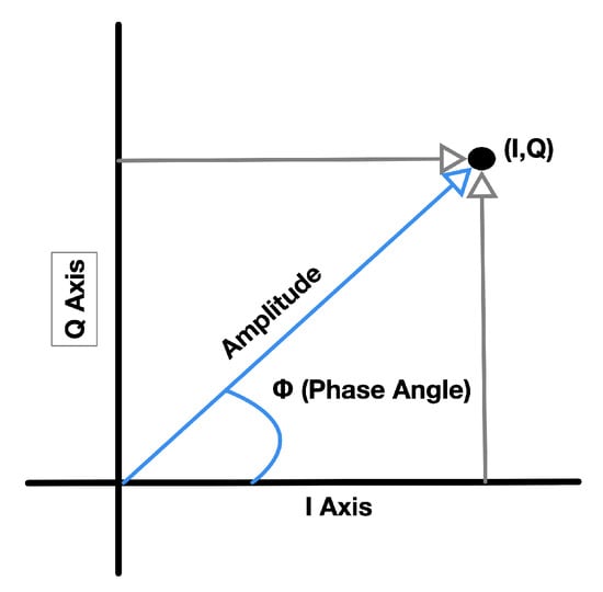 As introduced in [25], unique BLE 5.1 packets incorporate a CTE consisting of digital “1 s” to guarantee that the antenna receives a constant frequency for this part of the signal (rather than the changed frequency customarily employed to transmit BLE data). Besides, it is helpful to note that this information string is not “whitened”. Consequently, an adequately developed BLE radio that receives CTE information takes IQ examples throughout the CTE period. More in detail, a unique IQ sample is composed of the signal phase angle and amplitude expressed as cartesian coordinates (Figure 10).