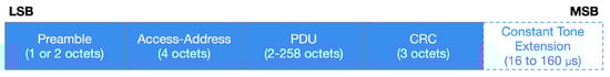 The specification introduced in [25,26,27] highlights that Bluetooth 5.1 requires modifications to the radio frequency “stack”, i.e., the software protocol. Moreover, also hardware enhancements are expected depending on the chip manufacturer. It is beneficial to heed that, as the main feature, the updated protocol attaches a CTE to every Bluetooth data employed for radiogoniometry. Otherwise, packets remain unchanged to be practiced for conventional BLE transmission [25,26]. The analysis of [25] denotes that CTE is not modulated and transmitted at 250 kHz or, seldom, more than 500 kHz when employing the more effective throughput method of Bluetooth. Its continuance is between 16 and 160 s. More in detail, as introduced in [25], CTE is composed of an “unwhitened” series of “1” communicated large adequate to permit the receiver to obtain the IQ information without modulation’s influences. As the CTE is transferred at the end, the Cyclic Redundancy Check (CRC) of the packet is not influenced.
