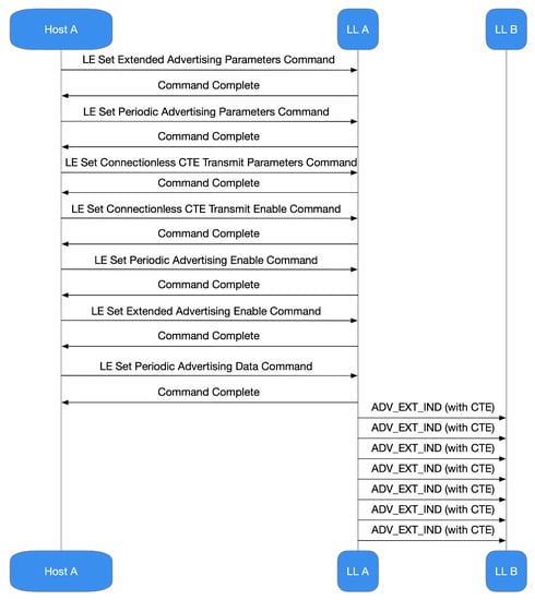 Bluetooth 5.1 does not broadcast data with CTE, nor does IQ sampling by default. It is up to the developer to set up the architecture to include these characteristics employing specific development instruments. The IDE and SDK concede the Host-Controlled Interface (HCI) management. Consequently, the host can practice it to set up the controller to make the CTE and IQ sampling. It is valuable to remark that, for connectionless situations (i.e., the model commonly practiced by AoD), the device delivers the subsequent startup stages of the controller (Figure 12):