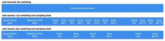 The period designated for CTE management is separated within an opening guard period of 4 s, a reference period of 8 s, and then into a series of switch slots, sample slots, or combinations of them (Figure 13). During the reporting period, no antenna switching happens, and eight IQ samples are collected. The device could employ the reference samples to determine the signal frequency and deduce the wavelength, improving the accuracy of the angle calculations.