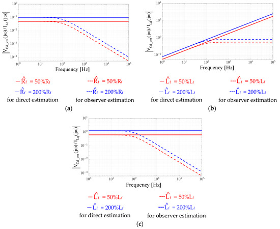 Figure 5 illustrates the error regarding the d-axis capacitor current estimation error ICdq_err resulting from the self-coupled d-axis inductor current ILd and cross-coupled q-axis current ILq, respectively. As seen from |ICd_err(jω)/ILd(jω)| in (a), a constant error occurs at low frequency. In contrast, for |ICd_err(jω)/ILq(jω)| in (b), the estimation error increases as frequency increases. Besides, Figure 5c shows the error on ICd_err caused by the self-coupled d-axis voltage command . As seen from Equation (15), the estimation error also increases as frequency increases. A similar result can be found for the error on cross-coupled |ICd_err(jω)/ILq(jω)|. Based on the sensitivity analysis on the direct estimation in Equation (13), the error results in a constant estimation error on at low frequency, and more importantly, the estimation error increases as the operating frequency increases. Below, a closed-loop observer-based current estimation is proposed to reduce this parameter sensitivity.