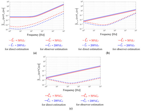 Estimation accuracy evaluation of between direct estimation in (4) and proposed observer in Equation (9): (a) error on |VCd_err(jω)/ILd(jω)|, (b) error on |VCd_err(jω)/ILd(jω)|, and (c) error on |VCd_err(jω)/ILp(jω)|.