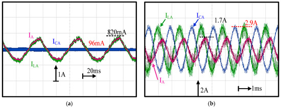 This part demonstrates the influence of the LC filter on the FOC machine drive. Figure 10 compares three different A-phase currents—the inverter output current, ILA, capacitor current ICA and machine actual current IA in Figure 1, respectively—at (a) a low speed of 1 krpm and (b) high speed of 40 krpm. As seen in Figure 10a, the inverter current ILA and machine current IA were nearly the same, while the capacitor current ICA contained some PWM harmonics. Besides, current waveform distortion was observed on both ILA and IA. In general, the PWM inverter contained the deadtime effect, affecting the current regulation, especially at low speed. In this paper, the dead-time compensation was applied based on the direct voltage compensation dependent on the phase current polarity [25]. In contrast, at high speed, as shown in Figure 10b, a visible magnitude and phase difference between ILA and IA were observed due to the high magnitude of ICA. Based on this experiment, it is concluded that, at high speed, the actual machine current IA must be obtained to stabilize the FOC drive.