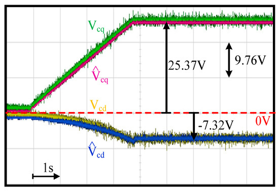 Figure 3 also illustrates the same estimation accuracy of |VCdq_err(jω)/ILdp(jω)| based on the proposed closed-loop voltage observer. In this simulation, Kp_V and Ki_V are selected to achieve a 100 Hz bandwidth considering high-frequency noise reduction. Considering the parameter error in Figure 3a, VCdq_err is reduced when the operating frequency is beyond the observer bandwidth, as presented by the dashed lines. Besides, for the error resulting from self-inductance in (b) and cross-inductance in (c), VCd_err also maintains constant values or decreases beyond the observer bandwidth. By applying the proposed voltage observer in Figure 4, it is shown that the influence of filter parameter errors on is reduced due to the closed-loop control regulation.