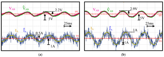 Figure 13 further illustrates the time-domain waveforms of machine AB-line voltage and machine A-phase current at a low speed of 1 krpm (16.67 Hz) with respect to the externally measured VAB and IA. Both (a) a 25% load and (b) a 50% load were compared based on different fan load sizes. For the voltage estimation, was close to VAB at different loads. It is noted that the filter cutoff frequency was designed at 2.92 kHz. In this case, the PWM voltage could be removed in both VAB and , leading to nearly sinusoidal voltage waveforms. In contrast, for current estimation, a relatively low signal-to-noise ratio was observed in . As mentioned in Equation (18), the machine current was estimated from voltage disturbances through the RLC circuit model. This voltage was relatively small at low speed, resulting in estimation noises. However, the magnitudes between and IA were almost the same. It is concluded that the proposed machine current estimation can still be used for FOC current regulation.