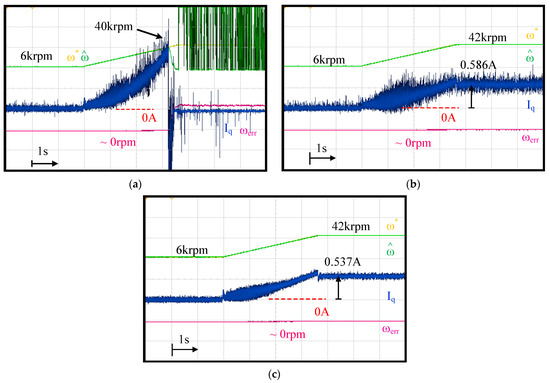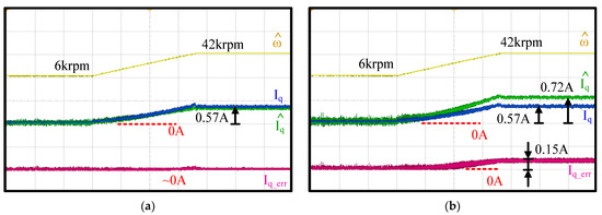 Figure 14 shows the time-domain waveforms of the measured speed, measured and estimated machine Iq and and the estimation error . The test condition was the same as in Figure 11 and Figure 12 in terms of the FOC acceleration. In (a), a 50% capacitor parameter error was intentionally added in the proposed current observer. The current estimation error was negligible as the speed accelerated from 6 krpm to 42 krpm. Thus, the proposed current observer demonstrated negligible sensitivity under the filter capacitor variation. This test result is consistent with the analytical model in Figure 5c.