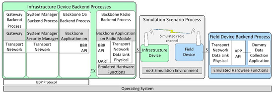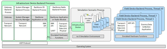 - Boehm, S.; Koenig, H. SEmulate: Seamless network protocol simulation and radio channel emulation for wireless sensor networks. In Proceedings of the 2019 15th Annual Conference on Wireless On-demand Network Systems and Services (WONS), Wengen, Switzerland, 22–24 January 2019; pp. 111–118. [Google Scholar] [CrossRef]