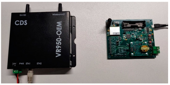 The implementation architecture is based on the CDS VR950 gateway [52] as the infrastructure device and the CDS VS210 development board [53] as the field device. These devices are commercially available, and they contain an ISA100.11a certified radio module with a software stack.