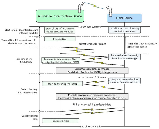 - Data collecting initialization time for the first device to start transmitting data, which is measured from the start of the scenario until the first collected data sample arrives to the infrastructure device. This metric is highly dependent on the behavior of medium access mechanism, as during start-up of the IWSNs RF, collisions are expected.