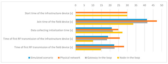 The data collecting initialization time of the simulated and physical networks is quite similar, both as mean value and as relative standard deviation of the experimental runs. The simulated networks have started data collecting some seconds earlier than the physical networks—this is probably related to the implementation of the carrier sense multiple access (CSMA) mechanism in the simulator. There might be a difference between the CSMA behavior of a physical and simulated medium, such that the simulation allows more aggressive access to the RF channel, thus allowing a simulated field device to finish the configuration message exchanges earlier and to start sending data to the infrastructure device earlier than the first device in the physical network scenario.