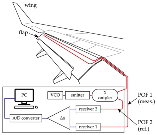 A POF elongation sensor can be useful to measure the elongation of an aircraft flap, as reported in [,]. Figure 1 shows the schematic of the set-up and its working principle. It relies on the comparison of the phase difference between two modulated light signals: a variation due to an elongation of one of the POFs (POF 1) leads to a phase shift in the signal arriving to the corresponding photodetector (Receiver 1).