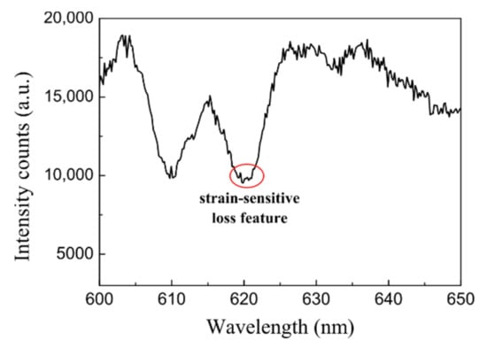 Another POF elongation sensor relies on the use of long-period gratings (LPGs) written on single-mode mPOFs [,]. This is possible because, as shown in Figure 4, the transmission spectra of the LPGs show loss features at the resonant wavelength (where the core mode couples to a cladding mode) and this resonant wavelength changes with the applied strain. Thus, any increase in the strain applied to the LPG implies a decrease in the resonant wavelength. In contrast, in the case of FBGs, the amount of Bragg wavelength shift with axial strain is positive.
