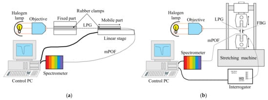 To test the response of the sensor, two different scenarios were considered (see Figure 5). In the first one, two rubber clamps hold the LPG mPOF. The linear stage applies a uniform strain to one end in order to test the linearity of the response of the sensor (see Figure 5a). In the second scenario, the LPG mPOF is bonded to the surface of a rectangular steel plate. A silica-based FBG is also attached to the opposite surface on the steel specimen as a reference. The plate is then subjected to different loading conditions by means of a traction/compression machine (see Figure 5b).