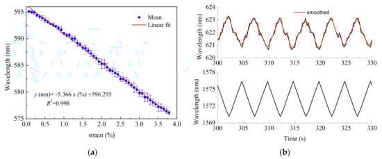 Figure 6a illustrates the results obtained in the first scenario for ramp-like movements under usual component testing conditions (strain values under 5%). The sensor exhibits a high degree of strain linearity. However, for small strain values, there is a non-linear behaviour attributed to the absorption of part of the stress by the rubber clamps. Figure 6b shows the results obtained in the second scenario for a triangular-like tension cycling. The upper curve corresponds to the response of the LPG mPOF sensor and the lower curve to the response of the FBG reference sensor. The signals provided by both sensors are out of phase 180° due to the opposite polarity of the slope of the wavelength with the applied strain between the LPG mPOF and the FBG. The response to the strain is linear, even though the fluctuations observed are due to the limited resolution of the spectrometer and the data acquisition sampling frequency is different to the traction frequency. Anyway, it is still possible to conclude that the LPG mPOF sensor shows an excellent behaviour for monitoring the strain.