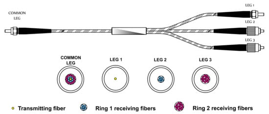 García et al. show in [] a reflective intensity modulated optical fibre sensor. It consists of a trifurcated optical fibre bundle as presented in Figure 7. It is 3 m long and it can be made of multimode POF or GOF. The central core of the common leg corresponds to the transmitting fibre and it is connected to Leg 1. In contrast, the inner and outer rings of the fibres of the common leg collect the reflected light, and they are connected to Legs 2 and 3, respectively. Figure 8 shows the experimental set-up. It is important to note that the maximum operating temperature is currently limited to 60 °C due to the glue used to assemble the POFs in a bundle. However, since the sensors are fixed to the casing of an aircraft engine in the first stage of the compressor, temperatures will not be an issue in the following measurements. All tests have been performed in a turbine rig with a rotor of 146 blades. These blades reflect the light impinging from the illuminating fibre. The reflected light is collected by both rings of the receiving fibres. Afterwards, the photodetectors connected to Legs 2 and 3 carry out the photoelectric conversion. Finally, the digital sampling oscilloscope acquires these signals [,,,].