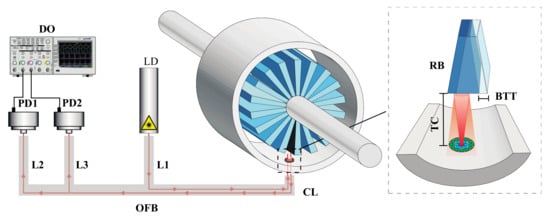 BTT and TC measurements are critical to assess the operation of turbines. Whereas the BTT measurement provides useful information for SHM, the TC measurement relates to engine efficiency. On the one hand, most BTT solutions used by industry employ several sensors mounted circumferentially and they are still based on algorithms established at the end of the 20th century, even though several alternatives are currently being explored (more details can be found in []). On the other hand, there are several TC measurement systems that use different technologies, such as capacitive, eddy current, pneumatic, strain gauges, electromechanical, microwave, and optical sensors (see the introduction in [] for additional details). Nevertheless, optical sensors provide fast response, high resolution, and accuracy, and thus they are able to provide more detailed information than other commercial systems [].