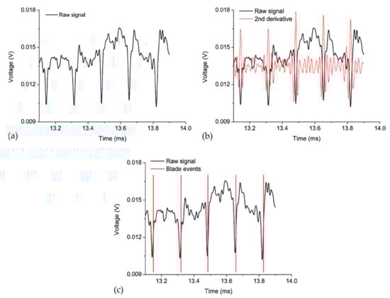Data processing in order to estimate the BTT: (a) raw signal of the quotient from both photodetectors; (b) second derivative of the raw signal; (c) blade events calculated form the second derivative.