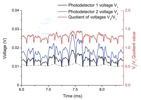 Figure 10 shows the raw signal of 15 consecutive blades obtained from both photodetectors as well as the quotient (in red) when the turbine rotates at 3148 rpm. The TC is obtained from the quotient of the photodetector voltages, according to a calibration curve measured previously []. The response of the optical sensor was compared to that of a discharging probe sensor, which is a device typically used for TC measurements. The differences between them are in the order of some tens of microns and the relative difference is less than 3% although the optical fibre sensor gives accurate information of every blade.