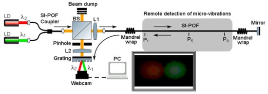 Two laser diodes (LDs), with λ1 = 532 nm (Green) and λ2 = 650 nm (Red), respectively, were multiplexed using a 50:50 coupler. The light beam composed by λ1 and λ2 was next directed to a 3-dB loss beam splitter cube BS, so that 50% of the light’s intensity was injected into the sensing fibre lead. A standard PMMA SI−POF fibre with 980/1000 μm of core and cladding diameter, respectively, also including a jacket with 2.2 mm of diameter was used as the sensing fibre lead. The fibre deployed had a total length of 11 m and included two mandrel wraps to improve the modal distribution along the fibre and to eliminate possible non-guided modes produced by the external disturbances along the fibre. Finally, the mirror at the farthest end-face of the SI−POF reflected the light back to the fibre lead, reaching the BS cube located at the interrogation unit that deflects 50% of the reflected intensity to the webcam. The light beam reaching the webcam contained the speckle patterns of both λ1 and λ2 (please refer to the inset of Figure 11). Both patterns were then demultiplexed and focalized on different spatial locations of the same webcam by using a transmission-customized diffraction grating with a groove density of 1200 lines/mm []. Therefore, the proposed system allows analysing two independent speckle patterns recorded at the same instant. This is a very useful performance to minimize the great impact of the random interference of fibre modes, i.e., modal noise.