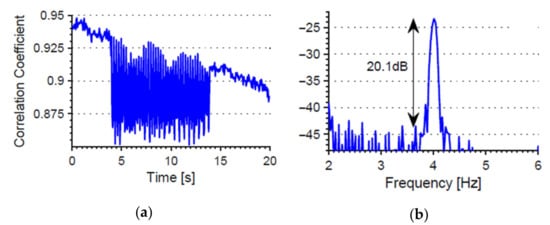 The proposed method for remote detection of micro-vibrations computes first the correlation factor between the time-varying speckle patterns recorded by the webcam at the two wavelengths related to a reference pattern, then it takes the average of 20 consecutive speckle patterns, and afterwards it computes the resulting mixed correlation signal of the latter. Figure 12 shows the results of this mixed correlation signal after data processing. The experiments show a 2.6 dB increase in the signal-to-noise ratio compared to the results obtained from the correlation signal obtained from the single-wavelength approach. Micro-vibration resolutions below 0.2 μm were achieved, well below the measured and estimated displacements in the aircraft’s structural bodies of interest [,,], thus making this method suitable for aircraft vibration monitoring applications. There is no need for a bare fibre or reducing the number of modes to achieve an enhanced resolution.