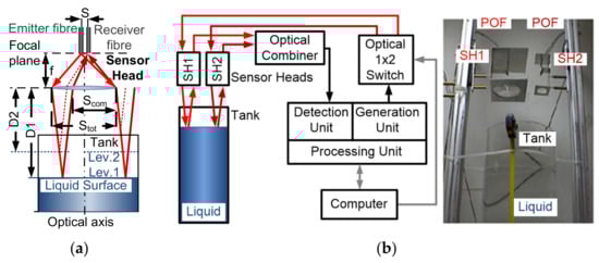 In aircrafts, the main disadvantage of electronic sensing solutions is the risk of explosion as the electrical current must be introduced into the flammable (or simply conducting) liquid. Optical fibres have been used for measuring liquid levels in many forms: some are non-intrusive sensors based on light attenuation while passing tank walls, as in [], but are only useful in transparent tanks; other non-intrusive, inherently safe POF-based liquid-level sensors use POF fibres for greater light reception []. Its principle of operation is based on the attenuation suffered by the light transmitted from the emitter fibre to the received fibre when it is reflected by the liquid surface. The two fibres are placed in the focal plane near the lens focus; in this way, the reflected beam suffers a lateral displacement that depends on the distance between the lens and the liquid surface, as is shown in Figure 13a. The lens determines the range and sensitivity of each sensor. In addition, the system includes a 1 × 2 liquid crystal-based optical switch that allows performing a time division multiplexing technique between the two sensor heads (see Figure 13b), although easily scalable []. A resolution of around 1 cm of liquid height is achieved. The liquid level varied from 1.90 m to 1.46 m in height. However, random vibrations, such as in transportation systems, can introduce additional errors.