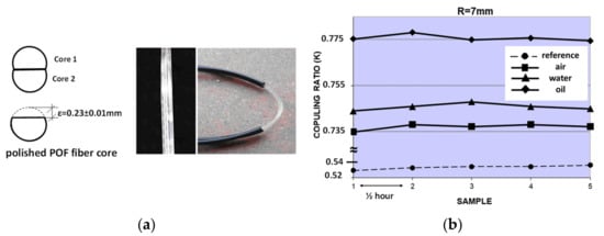 Experimental measurements to show the proof-of-concept of the proposed sensor were carried out. The coupling ratio values for Carthamus tinctorius oil (n = 1.466) and water besides the air surrounding the sensor for different bending radii (R) (see Figure 14b for the R = 7 mm case) were tested. The time between samples was ½ hour. The reference measurement refers to an unbent POF sensor with no surrounding liquid, i.e., air. The self-reference property of the proposed liquid level was tested for induced optical link losses up to 4 dB.
