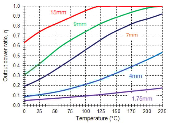 The ratio of output power to input power changes with temperature. This variation depends on the radius of the curvature, as is observed in Figure 16. There is a trade-off between sensitivity, linearity, and total losses that needs to be considered when designing the sensor. A bend radius of 2 mm provides a good linearity. Different self-reference techniques have been proposed, such as using a dummy sensor or using two wavelength bands from a sliced broadband source []. The obtained sensitivity is 1.92 × 10−3 °C−1 when the dummy sensor is used and 8.95 × 10−4 °C−1 in the two wavelengths set-up.