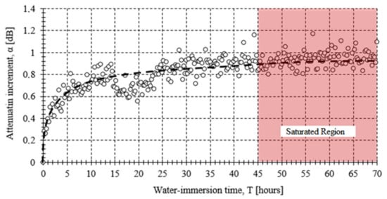A consideration to take into account when using POF sensors into aqueous media is that the water absorption can greatly affect the sensor performance during the first immersion hours. Test of a macrobend sensor dipped in water is reported in []. We have developed different measurements with a macrobend sensor dipped in water at 50 °C and using an oven to keep the temperature stable. The larger variation in the water absortion occurs in the first 20 h of immersion and the stabilization arrives after 45 h, as is shown in Figure 17. The absorption saturation level is close to 1.35%, a value reached when there are no longer mass changes observed in the sample. After that time, there are attenuation variations of 0.06 dB. They are equivalent to those presented in dry sensors when an increment of air temperature of around 4 °C happened.
