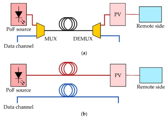 For many years, large-core SI-POFs have been considered a potential candidate to deploy a dedicated backbone, guaranteeing gigabit speeds in many applications such as home networking [] and automotive [] fields thanks to their easy installation and high bending tolerance. Coexistence of PoF signals and data traffic over the same POF fibre lead is then envisaged, with the need of MUX/DEMUX devices to combine/split the data traffic as well as the PoF signal into the same POF fibre (shared scenario); in contrast, in a dedicated fibre scenario, two independent fibres would be used for data transmission and PoF delivery []. Both scenarios are shown in Figure 18.